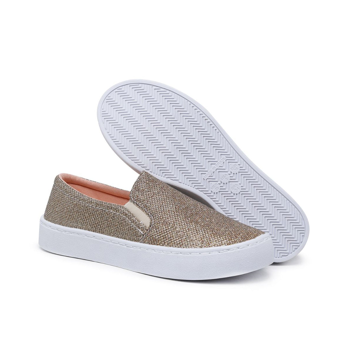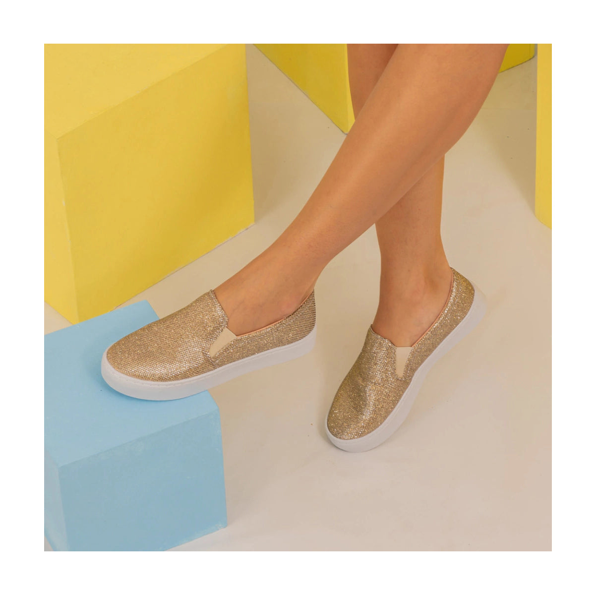 O Tênis Slip On Feminino em glitter dourado é a tendência da moda que você precisa. Essencial para qualquer look, ele combina com saias, calças, vestidos ou shorts, proporcionando praticidade e estilo.